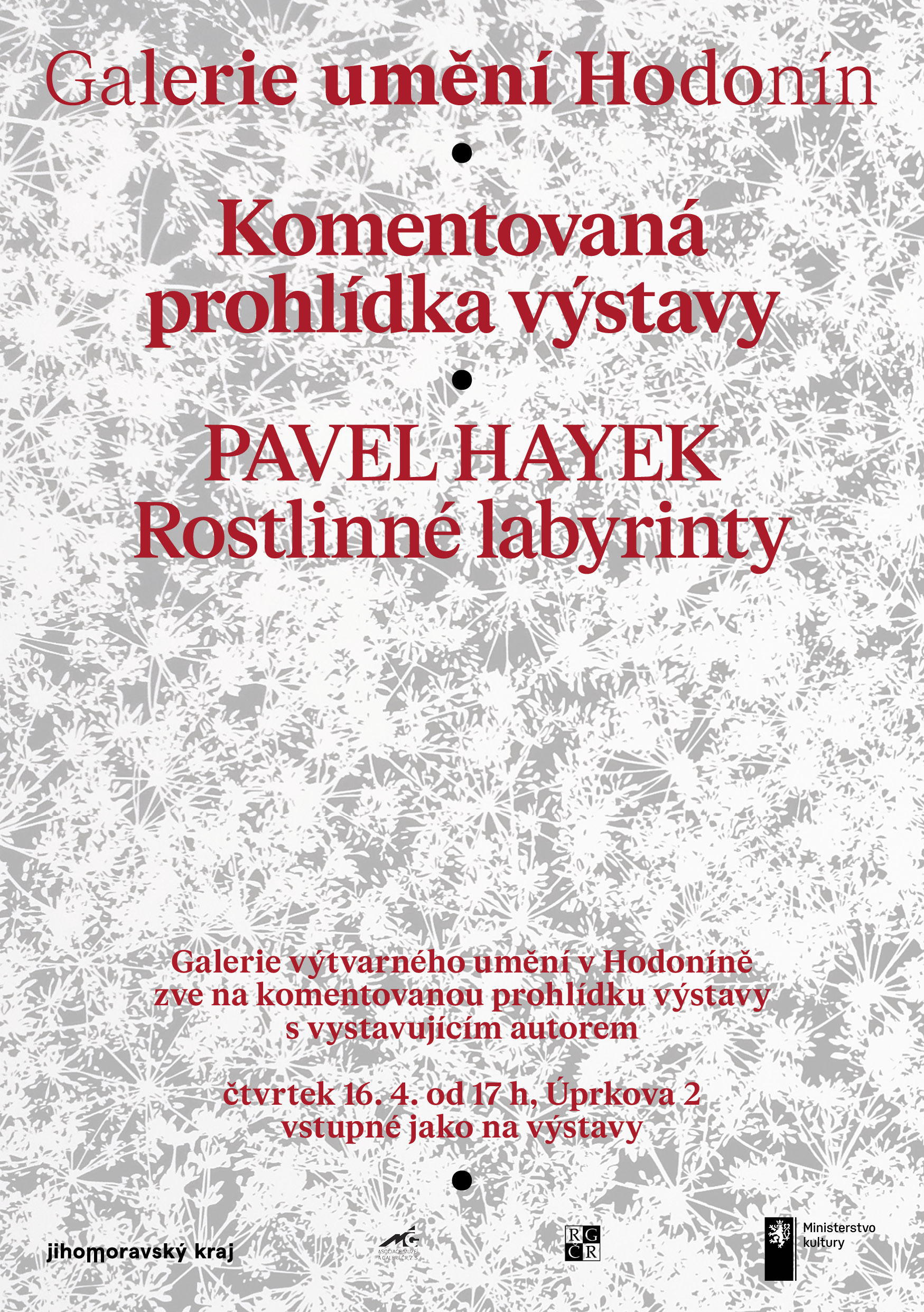 Zveme Vás tímto na komentovanou prohlídku výstavy Pavel Hayek | Rostlinné labyrinty s autorem, která proběhne ve čtvrtek 16. 4. 2026 od 17 hodin v Galerii výtvarného umění v Hodoníně, Úprkova 2. Vstupné jako na výstavy.