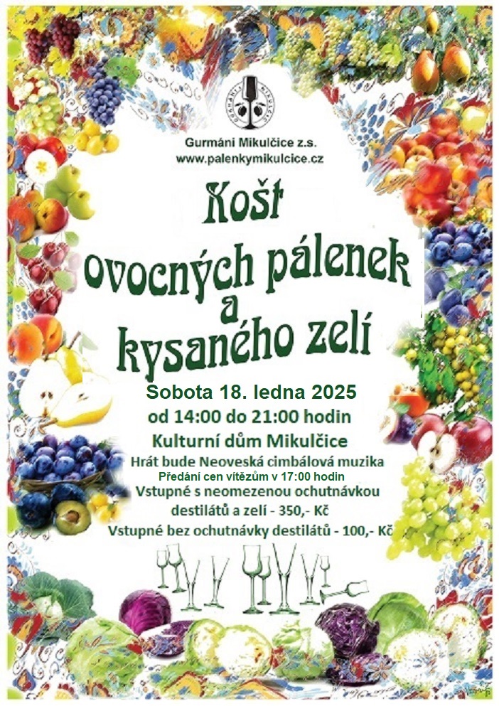 Spolek Gurmáni Mikulčice zve místní občany na 22. košt ovocných pálenek a kysaného zelí. Tento tradiční košt se uskuteční v sobotu 18. ledna 2025 od 14:00 hod. v kulturním domě Mikulčice.