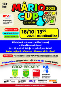 Srdečně Vás zveme na 22. ročník MÁRIO Cupu 2025 – turnaje v Člověče nezlob se pro dospělé, který se koná dne 18.10.2025 od 13 hodin na KD Mikulčice. Z důvodu kapacity turnaje nutnost předběžného přihlášení u pořadatele turnaje.